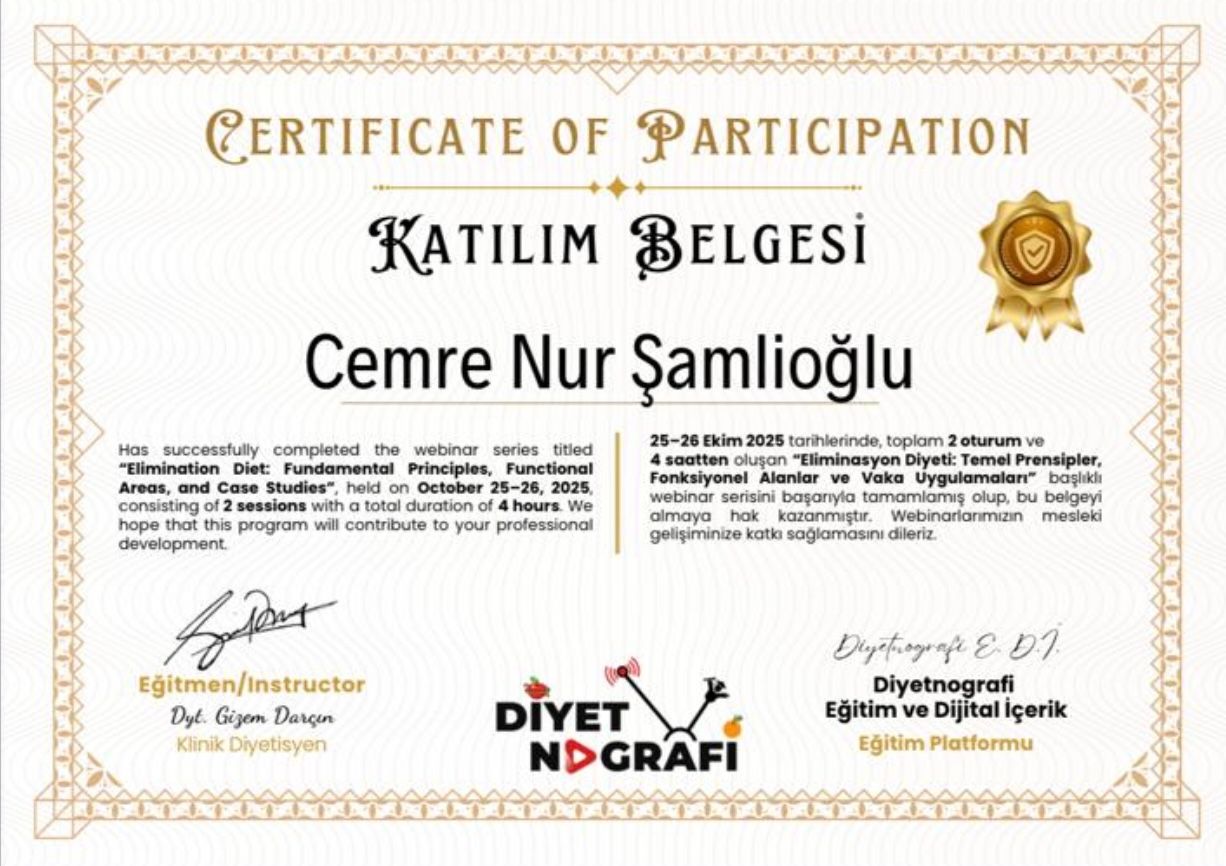 Ben Dyt. Cemre Nur Şamlıoğlu. Osmaniye Korkut Ata Üniversitesi Beslenme ve Diyetetik Bölümünü 2025 yılında tamamladım. Sağlıklı yaşam her zaman hayatımın merkezinde olduğu için bu mesleği seçtim ve insanların kendilerini daha iyi hissetmelerine eşlik etmek benim için büyük bir motivasyon kaynağı.